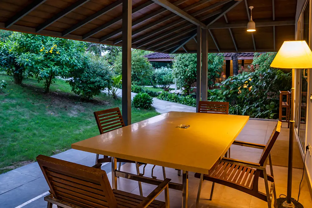 Virgo 2-bedroom cottage at Aashyana Lakhanpal, featuring a private veranda, garden seating, and a peaceful, nature-surrounded stay near the beach.