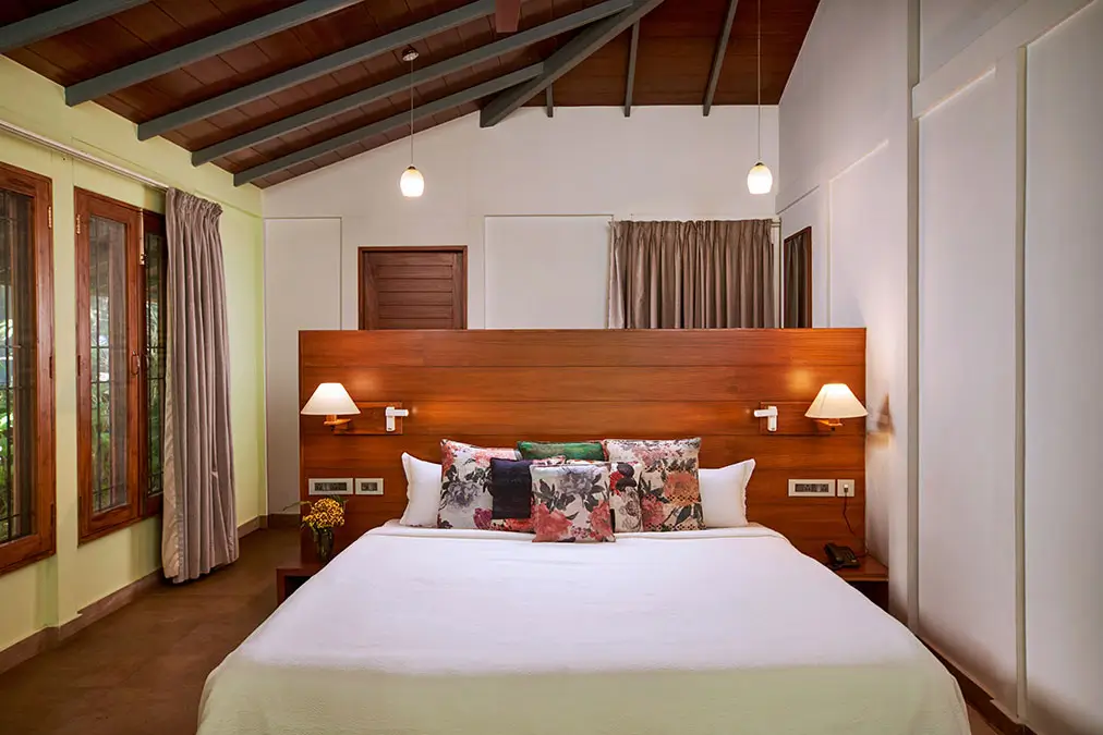 Inside, large glass windows keep the gardens close, with linen curtains softening the light through the day. The layout stays uncluttered and comfortable, right down to the discreet tea and coffee counter tucked behind the headboard. Step out to the sit-out verandah to read, talk, or simply pause, with the shared 25-metre pool just behind the cottage.